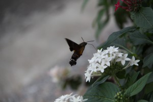 折りたたんでいる長~い管状のものを伸ばして、花の蜜を吸っているみたいなのですが、空中で羽ばたきながら止まっています。